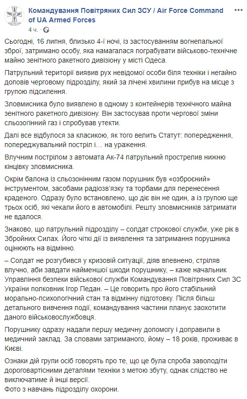 "Сегодня, 16 июля, около 4 ночи, с применением огнестрельного оружия задержан мужчина, который пытался ограбить военно-техническое имущество зенитного ракетного дивизиона в городе Одесса", – говорится в сообщении.