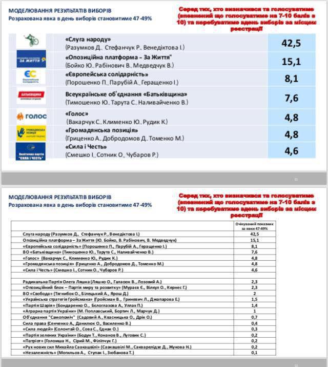 Исследование показало, что среди избирателей, которые намерены участвовать в выборах и уже определились со своими кандидатами, 42,5% собираются отдать голос партии "Слуга народа" во главе с Дмитрием Разумковым. 15,1% голос набрала партия во главе с Юрием Бойко и Виктором Медведчуком "Оппозиционная платформа - За жизнь". 8,1% у партии "Европейская солидарность" Петра Порошенко. 7,6% респондентов проголосуют за ВО "Батькивщина" Юлии Тимошенко.
