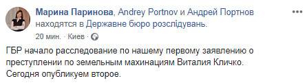 "ГБР начало расследование по нашему первому заявлению о преступлении по земельным махинациям Виталия Кличко. Сегодня опубликуем второе", - написала она.