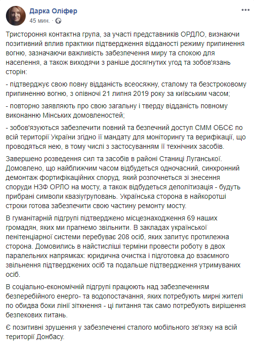 "В гуманитарной подгруппе подтверждено местонахождение 69 наших граждан, которых мы стремимся освободить. В учреждениях украинской пенитенциарной системы находятся 208 человек, которых запрашивает противоположная сторона", - написала Олифер по итогам заседания ТКГ