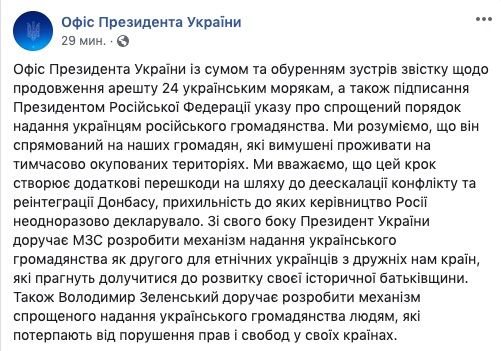 В ОП заявили, что понимают, что этот указ направлен на граждан Украины, которые вынуждены проживать на временно оккупированных территориях, и считают, что такой шаг создает дополнительные препятствия на пути к деэскалации конфликта и реинтеграции Донбасса.