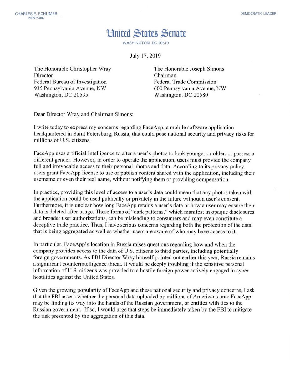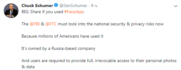 В США сенатор Чак Шумер обратился к Федеральной комиссии по торговле и ФБР с просьбой проверить приложение FaceApp из-за того, что его разработчиком является российская компания. Об этом Шумер написал в Twitter.