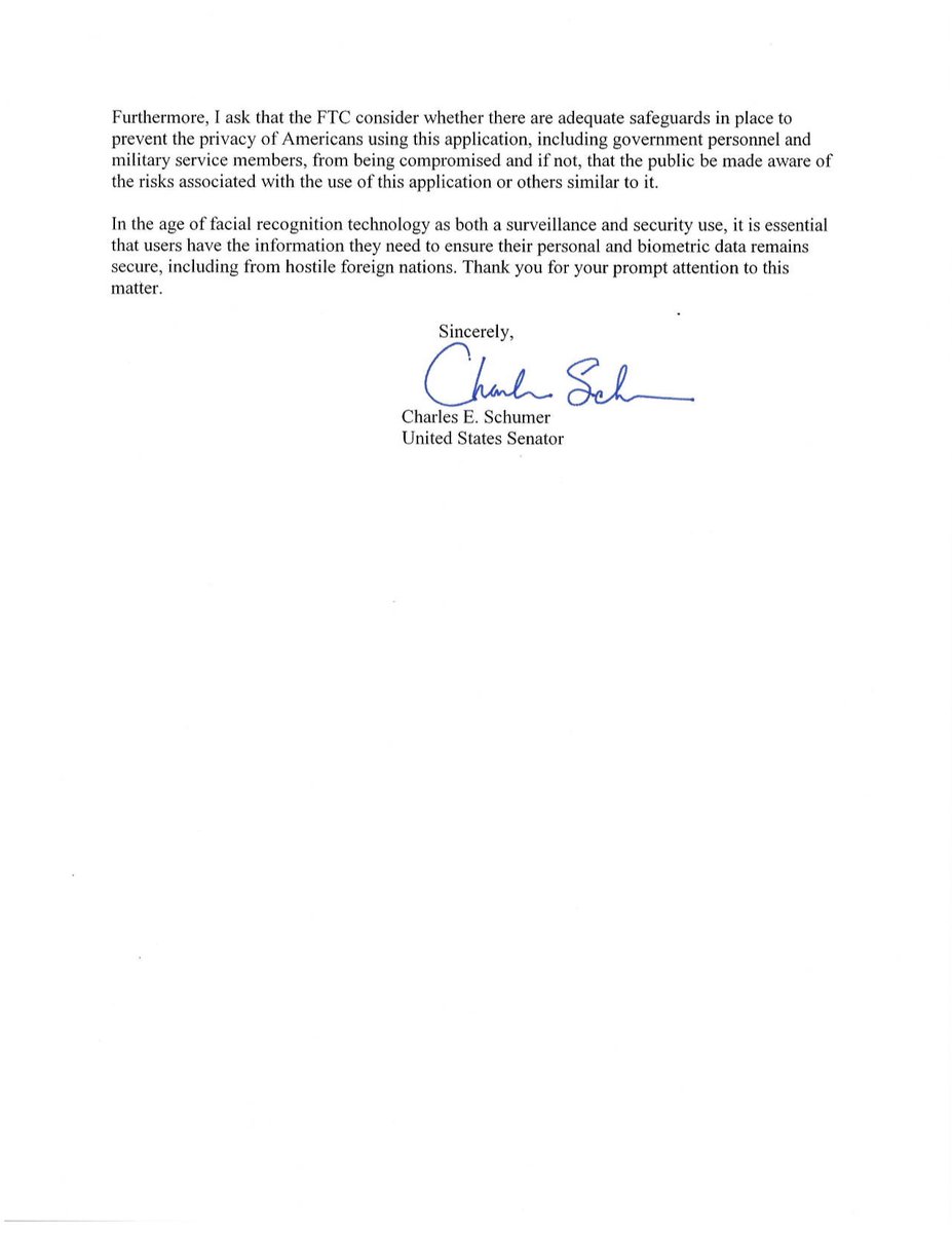 Сенатор Шумер в письме ФБР подчеркнул, что программа требует от пользователей полного доступа к их личным данным и фото. По его словам, это может грозить "безопасности и конфиденциальности" миллионов американцев, использовавших приложение.