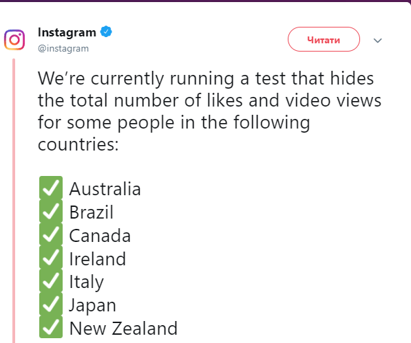 "В настоящее время мы проводим тест, который скрывает общее количество лайков и просмотров видео для некоторых людей в таких странах: Австралия, Бразилия, Канада, Ирландия, Италия, Япония и Новая Зеландия. Мы хотим, чтобы ваши друзья сосредоточились на фотографиях и видео, которыми вы делитесь, а не на том, сколько лайков вы получаете", - говорится в цепочке твитов.