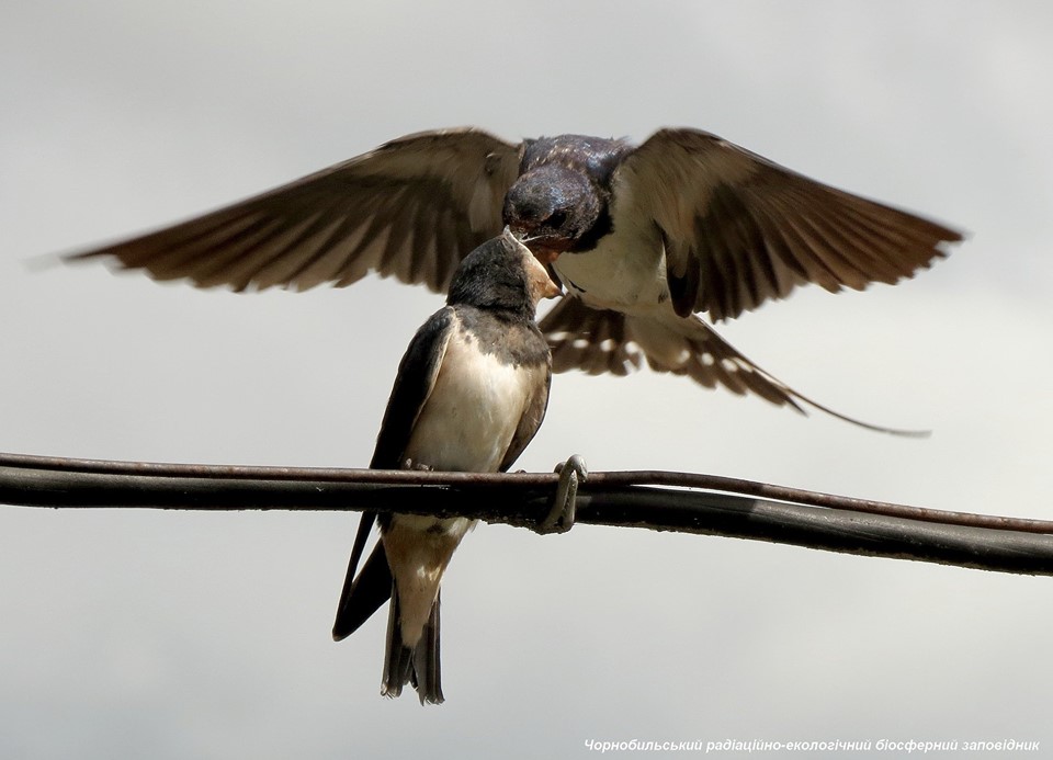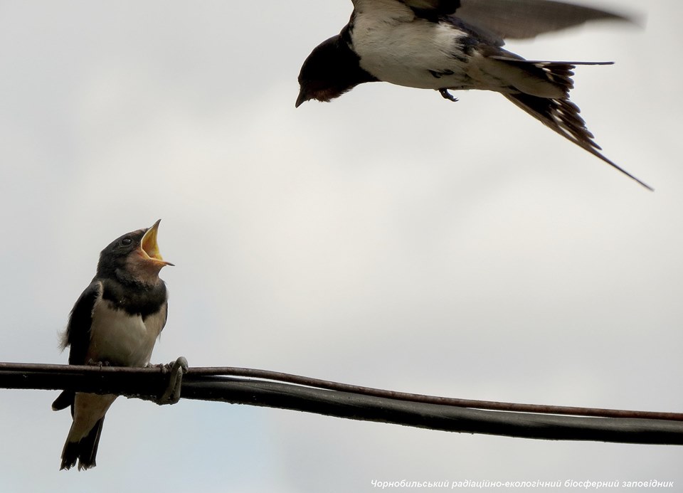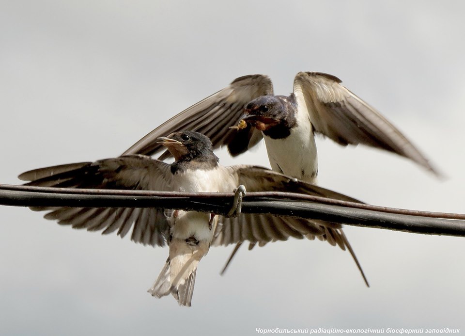Ученые в Чернобыльской зоне отчуждения показали, как деревенские ласточки кормят своих птенцов.