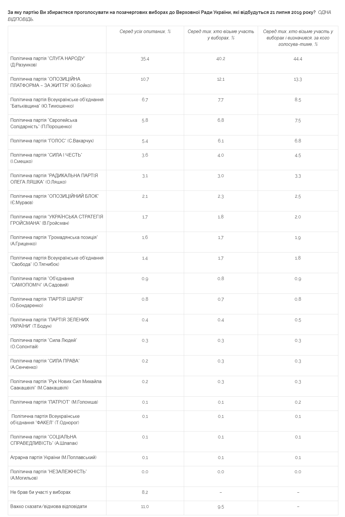 Партия "Слуга народа" набирает 35,4% среди всех респондентов и 44,4% среди тех, кто намерен принимать участие в выборах и уже определился, за кого будет голосовать. За партию "Оппозиционная платформа – За жизнь" намерены проголосовать соответственно 10,7% и 13,3%, за "Батькивщину" – 6,7% и 8,5%, за партию "Европейская Солидарность" – 5,8% и 7,5%, за партию "Голос" – 5,4% и 6,8%, за партию "Сила и честь" – 3,6% и 4,5%, за Радикальную партию Олега Ляшко – 3,1% и 3,3%.