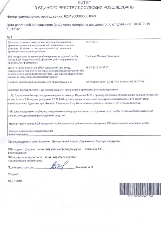 К сообщению она приложила вытяг из Единого реестра досудебных расследовании с номером 62019000000001069 согласно которому подано заявление о возможных незаконных действиях киевского городского головы Виталий Кличко при заключении договора аренды земли по адресу ул. Ямская, 23 литера "Б" с ООО "Техмонтажплюс".