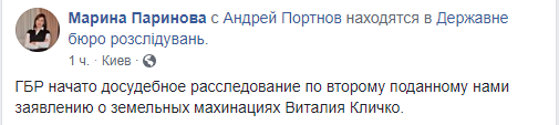 Напомним, накануне Марина Паринова   сообщила, что ГБР начало расследование по заявлению о преступлении по земельным махинациям Виталия Кличко. Речь о сделке с ООО "Роялти Тетрабуд", которая получила 0,14 га земли на проспекте Победы в Киеве для строительства и эксплуатации жилого дома.