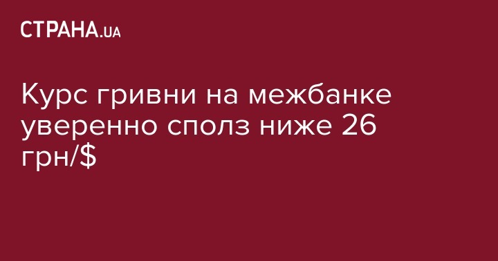 Курс гривни на межбанковском валютном рынке в четверг снизился до 26,055 грн/$1 с 25,88 грн/$1 в предыдущий рабочий день, сообщили агентству "Интерфакс-Украина" дилеры коммерческих банков. Котировки гривни к окончанию торгов составили 26,045-26,065 грн/$1.
