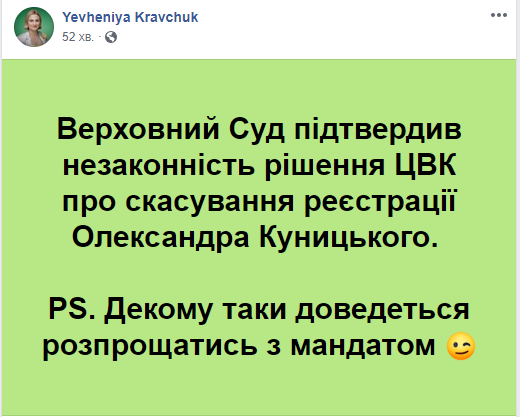 "Верховный суд подтвердил незаконность решения ЦИК об отмене регистрации Александра Куницкого", - сообщила на своей странице в Facebook руководитель пресс-офиса партии Евгения Кравчук.