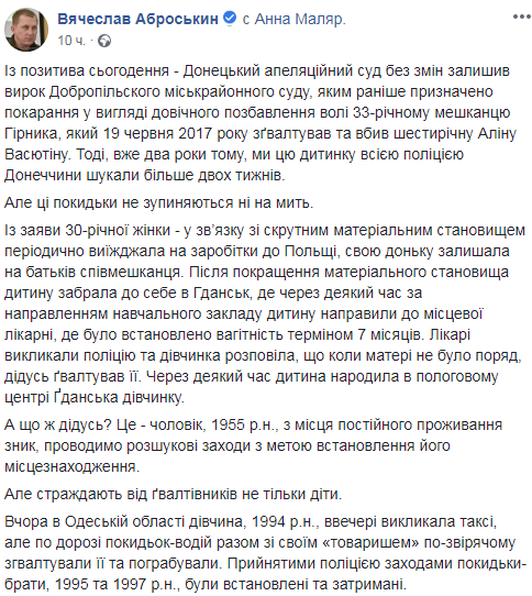В Донецкой области отец сожителя ездившей на заработки в Польшу женщины, насиловал ее дочь. Об этом говорится на fb-странице заместителя главы полиции Украины Вячеслава Аброськина.