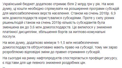 "Украинский бюджет дополнительно получит около 2 млрд грн в год. По моему мнению, эти средства необходимо направить на расширение программы субсидий для малообеспеченных слоев населения", – отметил Андрей Герус. По его информации, по состоянию на январь 2018 года 6,9 млн домохозяйств пользовались субсидиями, однако вследствие различных решений и событий по состоянию на январь текущего года количество субсидиантов уменьшилась до 3,6 млн домохозяйств.
