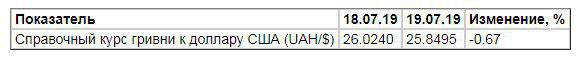 В пятницу, 19 июля, справочный курс гривни к доллару США на межбанковском валютном рынке снова укрепился до 25,85 грн/$1 с 26,055 грн/$1 в предыдущий рабочий день. Об этом сообщает Интерфакс-Украина.