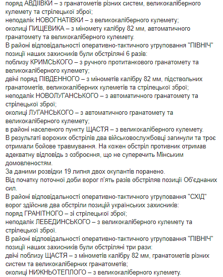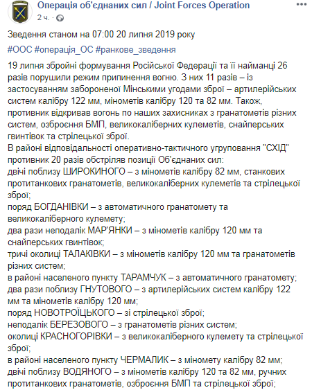 Сообщается, что на каждый обстрел противник получил адекватный ответ из вооружения, не противоречащего Минским договоренностям. По данным разведки, 19 июля двое противников получили ранения.