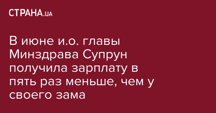 В июне исполняющая обязанности министра здравоохранения Ульяна Супрун получила зарплату 30 700 гривен, таким образом, она получила меньше, чем ее заместители. Об этом пишут "Украинские Новости".