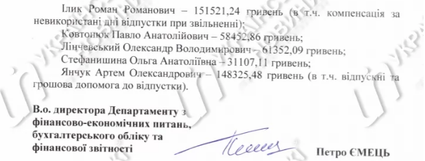 Зарплата заместителей министра Романа Илыка составила 151 500 гривен, Павла Ковтонюка - 58 500 гривен, Александра Линчевского - 61 400 гривен, Ольги Стефанишиной (уволена 12 июня) - 31 100 гривен и госсекретаря Артема Янчука - 148 300 гривен.
