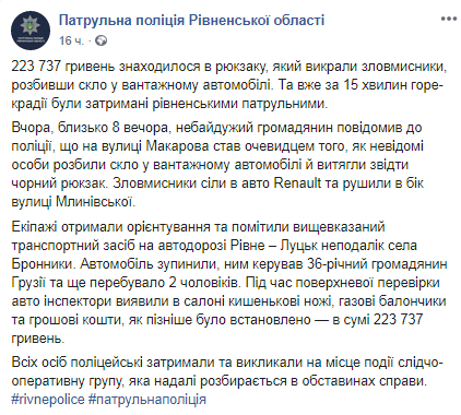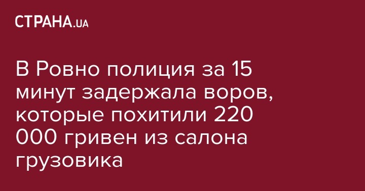Вечером в пятницу, 19 июля, в Ровно трое мужчин разбили стекло в грузовике и выкрали из салона около 220 тысяч гривен. Уже через 15 минут их задержали полицейские. Об этом сообщает пресс-служба Патрульной полиции Ровенской области в Facebook.