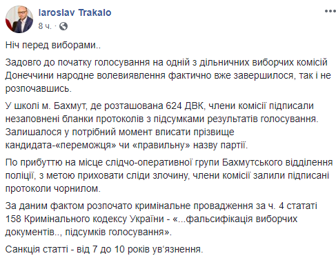 По данному факту правоохранители возбудили уголовное производство по ч.4 ст.158 Уголовного кодекса Украины – "...фальсификация избирательных документов.., итогов голосования". Санкция статьи - от 7 до 10 лет заключения.