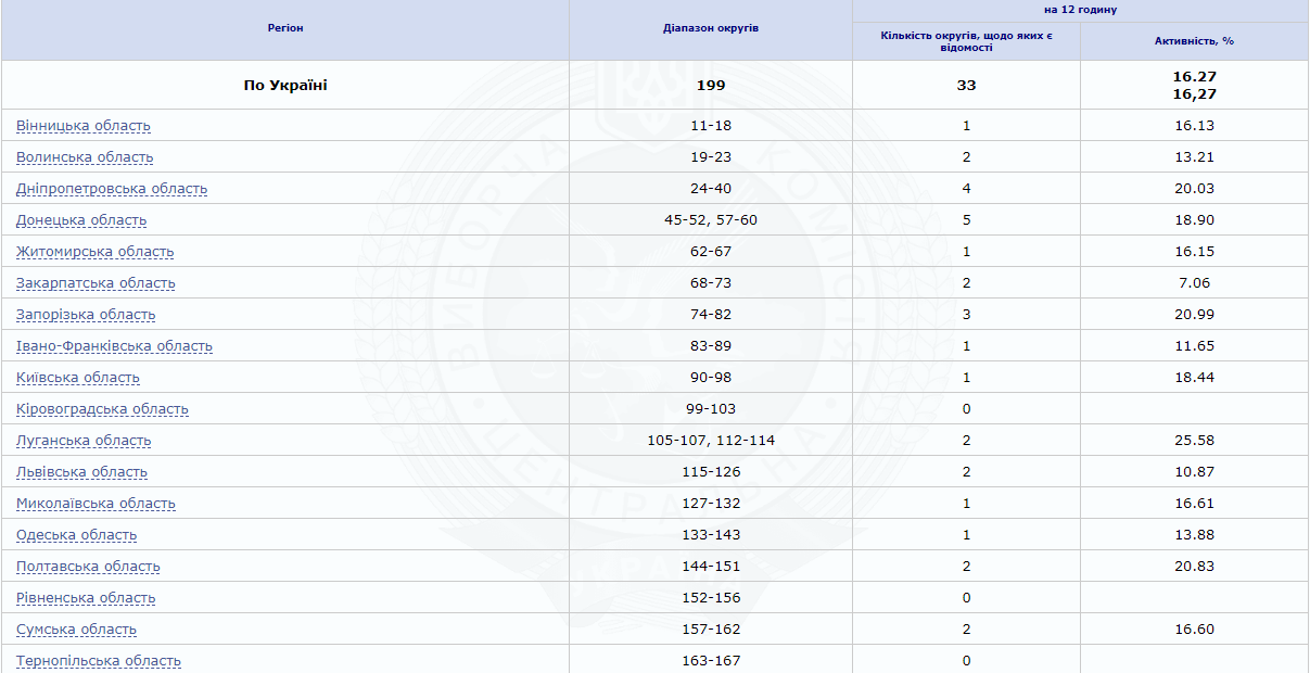 В 12:00 в воскресенье, 21 июля, явка на досрочных парламентских выборах в Украине составила 16,27%. Об этом свидетельствует информация на сайте Центральной избирательной комиссии.