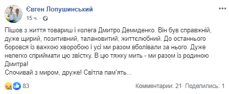 "Он был настоящий, очень искренний, позитивный, талантливый, жизнелюбивый. До последнего боролся с тяжелой болезнью и все мы вместе болели за него", - написал Евгений Лопушинский.