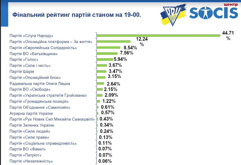 21 июля в Украине завершилось голосование на досрочных выборах в Верховную Раду. После закрытия участков в 20:00 Центр "Социс" и Комитет избирателей Украины обнародовали данные экзитпола. Пока по состоянию на 19:00. Сегодня данные еще обновятся.