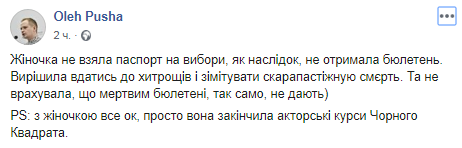 В Киеве на внеочередных парламентских выборах 21 июля женщина пришла на избирательный участок без паспорта и решила притвориться мертвой. Об этом в Facebook написал пользователь соцсети Олег Пуша.