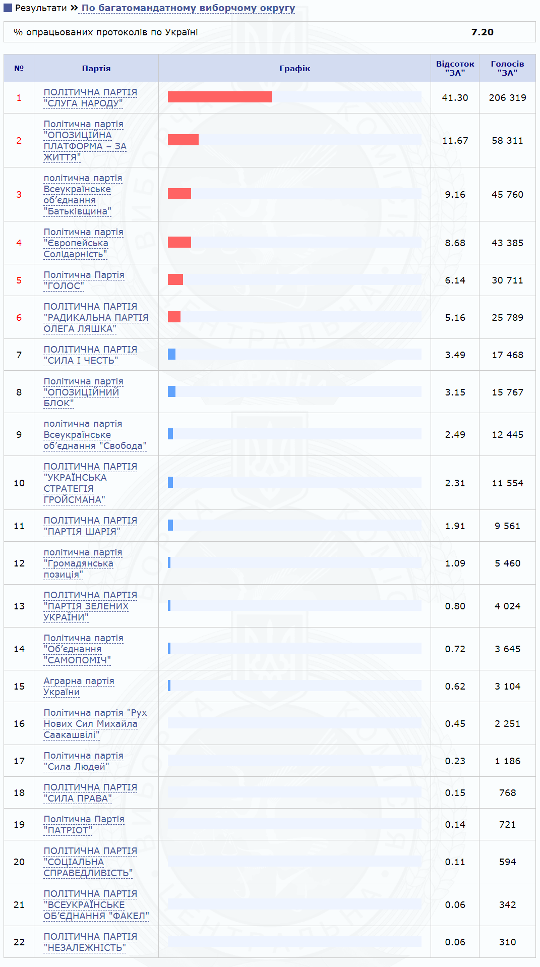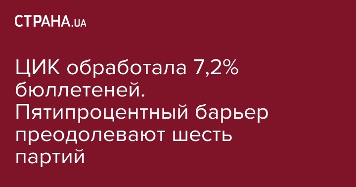 Центральная избирательная комиссия обработала 7,2% бюллетеней. Пока проходной барьер преодолевают 6 политсил. Данные по результатам обработки обнародованы на сайте ЦИК.