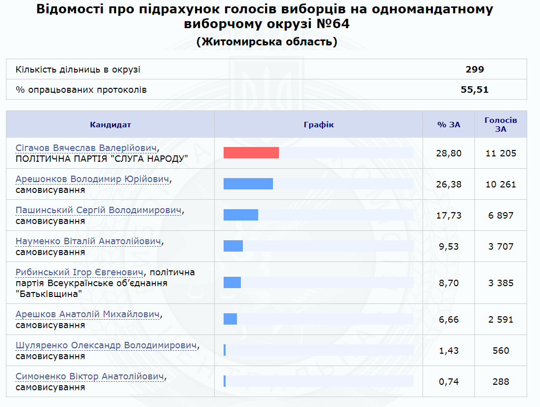 Победителем избирательной гонки на округе пока является кандидат от "Слуги народа" Вячеслав Сигачев. Ему отдали свое предпочтение 11 205 человек, или 28,8% избирателей.