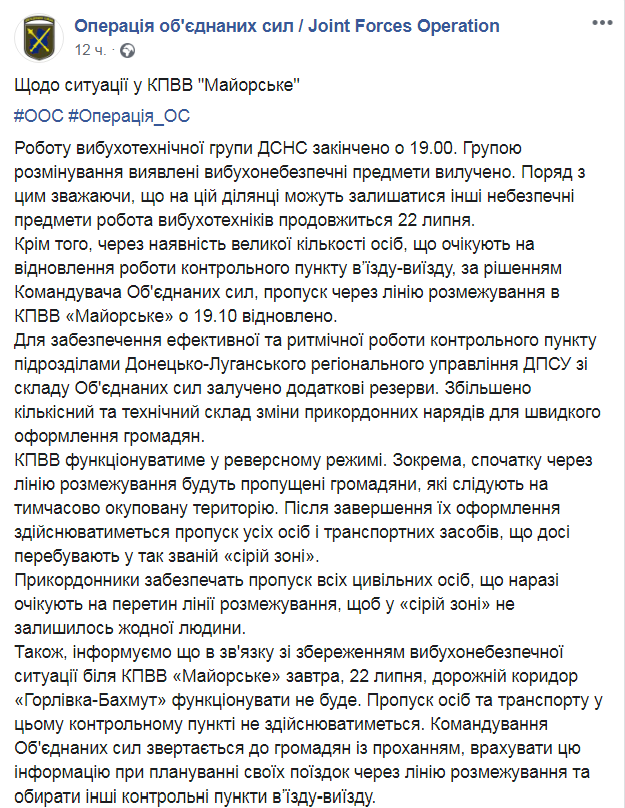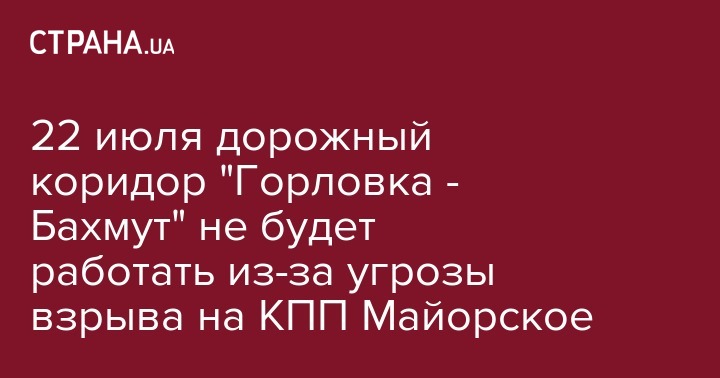 "В связи с сохранением взрывоопасной ситуации у КПВВ "Майорское" 22 июля дорожный коридор "Горловка-Бахмут" функционировать не будет. Пропуск лиц и транспорта в этом контрольном пункте не будет осуществляться", - уточнили в штабе ООС.