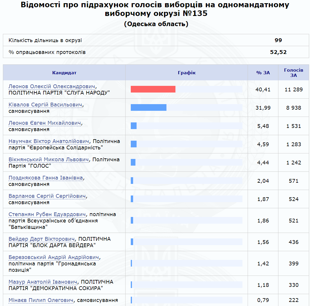 По результатам обработки 52,52% протоколов, в округе № 135 Одесской области Кивалов уступает кандидату от партии "Слуга народа" Алексею Леонову. За бизнесмена Леонова проголосовали 40,41% избирателей (11 тысяч 289 человек). За Кивалова почти на 10% меньше: 31,99; (8 тысяч 938 человек).