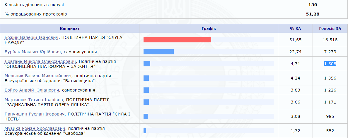 Отметим, что самовыдвиженец Бурбак конкурировал с кандидатом от "Слуги народа" Валерием Божиком и кандидатом от Оппоплатформы Николаем Довганем. Бурбак занял второе место (22,74%) и за него проголосовали 7 273 избирателей. При этом Божик обошел главу НФ с уверенными 51,65% или 16 518 голосов. На третьем месте оказался Довгань от ОПЗЖ, набрав 4,71% или 1 508 голосов.