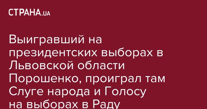 Экс-президент Украины Петр Порошенко, который одержал победу во Львовской области во время президентских выборов, проиграл там на парламентских, где его партия "Европейская солидарность" уступила голоса партии Святослава Вакарчука "Голос" и пропрезидентской партии "Слуга народа".
