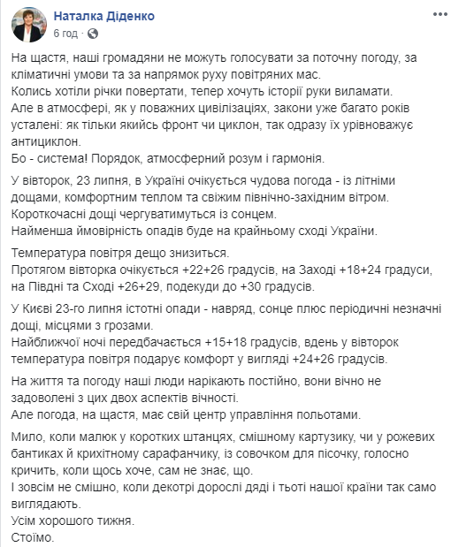 "Во вторник, 23 июля, в Украине ожидается чудесная погода – с летними дождями, комфортным теплом и свежим северно-западным ветром. Кратковременные дожди будут чередоваться с солнцем. Менее всего осадки вероятны на востоке Украины. Температура воздуха немного снизится. Во вторник ожидается +22... +26 градусов, на Западе +18... +24 градуса, на Юге и Востоке +26... +29 градусов, местами до +30 градусов", - предупредила Наталка Диденко.