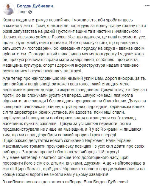 "Я никогда не пожалею о каждом потраченном часе пяти лет депутатства в родном Пустомыстовском районе и в части Лычаковского и Шевченковского районов Львова… Я не скрываю, что в большинстве работал как хозяйственник, потому что наведение порядка на округе считал своим приоритетом. Сегодня такой шанс выпал моему конкуренту и мне бы очень хотелось, чтобы все начатые дела получили завершение, особенно, чтобы образование, медицина, спорт, культура и дорожная инфраструктура и дальше уверенно развивались", - написал Дубневич на своей странице в соцсети facebook.