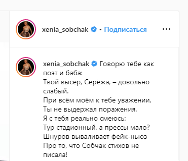 Собчак в ответ едко прошлась по музыканту, заверив, что Богомолов никогда не писал ей стихов.
