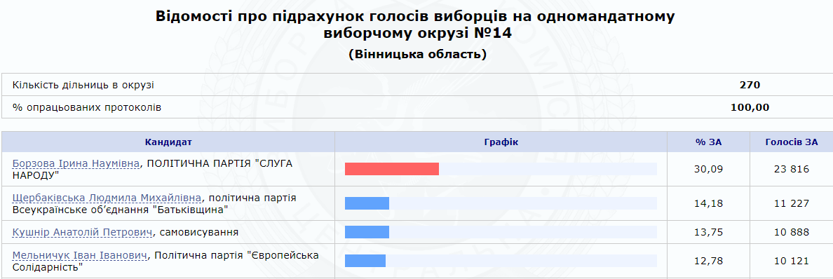 На выборах в Верховную Раду в одномандатном избирательном округе №14 (Винницкая область) победила кандидат от партии "Слуга народа" Ирина Борзова. Об этом свидетельствует информация на сайте ЦИК.
