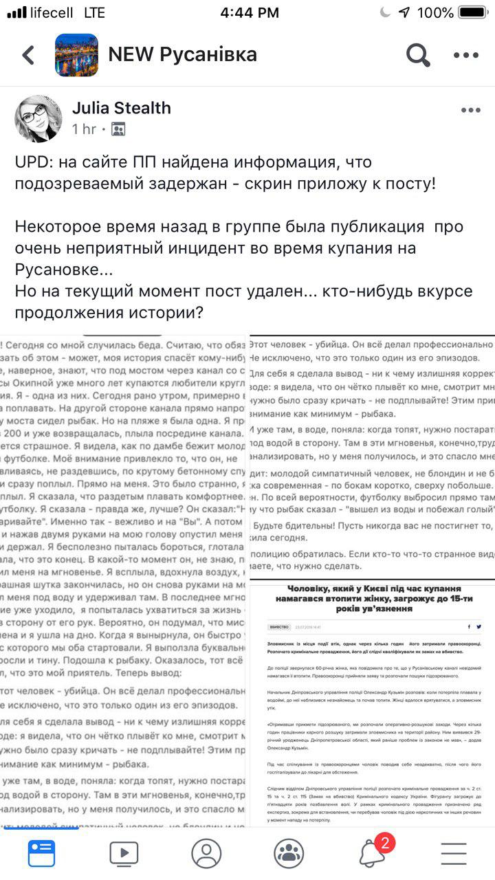 По данным следствия, 19 июля 2019 примерно в 06:30 подозреваемый, во время пробежки у Русановского канала, увидел ранее незнакомую ему 60-летнюю женщину, которая плавала в водоеме. Не раздеваясь, мужчина зашел в водоем и начал целенаправленно плыть к потерпевшей. Подплыв к женщине, подозреваемый начал обеими руками давить сверху на голову потерпевшей, удерживая ее под водой без доступа воздуха около 1 минуты.