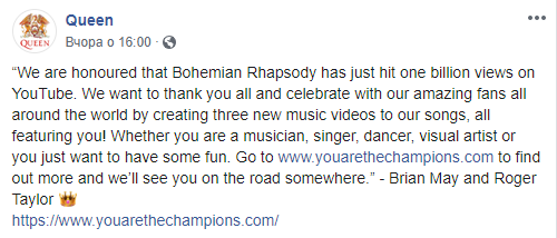 "Для нас большая честь, что Bohemian Rhapsody достигла миллиарда просмотров на YouТube. Мы хотим поблагодарить вас всех и отблагодарить, пригласив к участию в создании трех новых музыкальных видео к нашим песням. Независимо от того, музыкант вы, певец, танцор, художник или вы просто хотите немного веселья - переходите по ссылке www.youarethechampions.com, чтобы узнать больше", - говорится в сообщении.