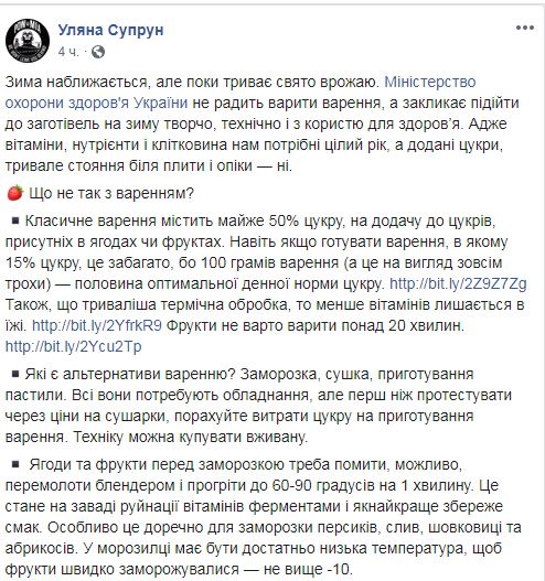 И.о. министра здравоохранения Ульяна Супрун сообщила, что варить варенье не стоит, поскольку в нем содержится много сахара.