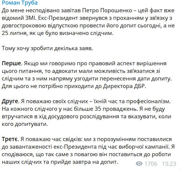 Третье. Я уважаю время свидетелей: мы с пониманием отнеслись к загруженности экс-президента во время избирательной кампании. Я надеюсь, что так же с уважением он отнесется к работе наших следователей и придет завтра на допрос", - ответил Труба Порошенко в Telegram.