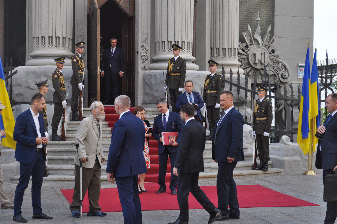 Появились фото, как Зеленский при выходе с Банковой встретился со стариком в тюбетейке
