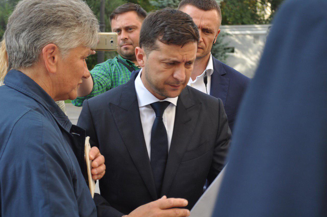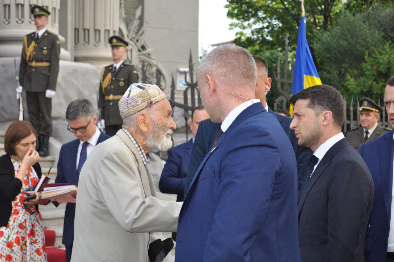 Как видно на фото, на выходе к Зеленскому подошел пожилой мужчина в тюбетейке, после чего президент записал что-то в свой телефон. Затем к нему подошел еще один мужчина.