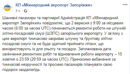 Скриншот: Facebook/ КП «Міжнародний аеропорт Запоріжжя»