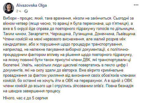"Сегодня за окном четверг, а уже в 5-м округе дело идет к повторному подсчету голосов по участкам. Таким образом, Закарпатье, Черкасская, Луганская, Донецкая, Львовская", - написала она на своей странице в соцсети Фейсбук в четверг.
