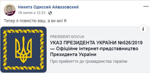 Известно,что 18 июля президент Владимир Зеленский дал ему, как  ветерану "Азова", украинское гражданство. Об этом сам Айвазовский написал в Facebook.