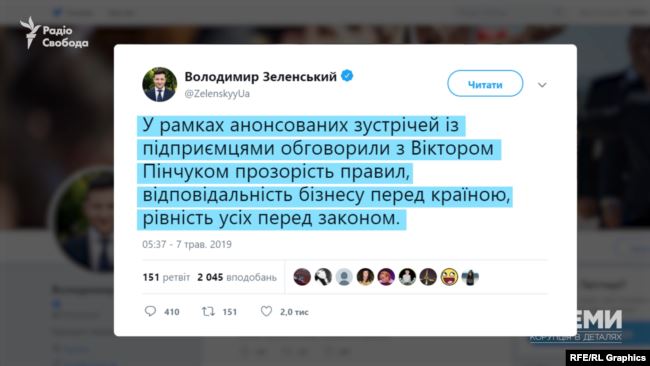 А 7 мая о встрече с олигархом Пинчуком в Twitter рассказал Владимир Зеленский: "В рамках анонсированных встреч с предпринимателями обсудили с Виктором Пинчуком прозрачность правил, ответственность бизнеса перед страной, равенство всех перед законом".