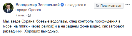 "Мы, везде охрана, боевые водолазы, спец контроль прохождения в море, на пляж - через рамки, а на заднем фоне видно, как загорают разведчики. Хороших выходных", - добавил президент ироничный комментарий к снимку. Вероятно он имеет в виду прошедшую вчера по СМИ информацию, что супруга Зе на днях сходила на пляж в Одессе для чего его перекрыли, а дно проверяли предварительно водолазы.