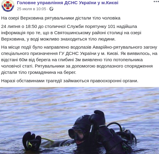 В Киеве вечером 24 июля спасатели достали из озера Верховина тело мужчины. Об этом сообщила пресс-служба ДСНС Украины в Киеве.