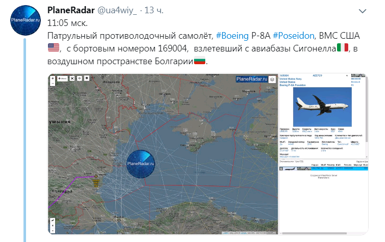 Как видно из данных мониторинга, опубликованных в Twitter, одним самолетом-разведчиком был противолодочный P-8A Poseidon. Он поднялся с авиабазы в Сицилии и на протяжении нескольких часов курсировал у границ Крыма.