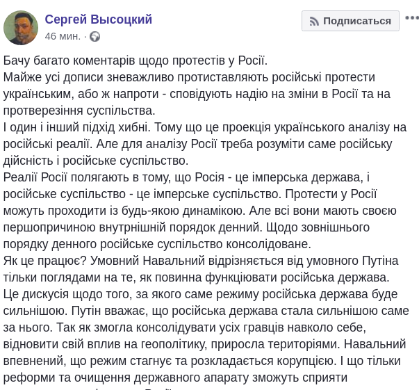 Журналист и политик Сергей Высоцкий, который участвовал в досрочных парламентских выборах 2019 года от партии Порошенко "Европейская солидарность" написал на своей странице в Facebook пост о том, что не стоит радоваться тому, что люди в России стали выходить на протесты за свободные выборы, так как для Украины лучше Путин, чем Навальный.